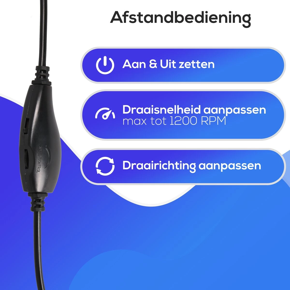 Met de afstandsbediening die in de kabel verwerkt zit, is de snelheid en de draairichting van het schuuroppervlak aan te passen. De snelheid van het schuuroppervlak is naar eigen wens aan te passen tot een snelheid van maximaal 1200 RPM (Rotaties Per Minuut).